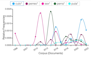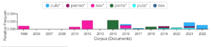 En mi primera investigación investigué la diferencia de todas las canciones sobre cada época que tuve en mis datos. Seleccioné palabras que tienen connotaciones sexistas para comparar el nivel de contenido sexual en cada año. Estas palabras son: culo perreo, sex*, perra*, y puta* (* incluye todas las terminaciones). Como se puede ver en el gráfico debajo, esta investigación primaria no reveló mucha información útil. Sin embargo, se puede ver que la usa de palabras sexuales más o menos empieza en 2010. Había 10 años en que no había un gran nivel de palabras sexuales.