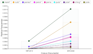 Después de esto, dividí la data en dos grupos, para comparar la diferencia en la usa de lenguaje sexista entre dos generaciones de reggaetoneras. Lo que encontré es que la usa de lenguaje sexista ha aumentado muchísimo sobre los años. Primero, yo veía la diferencia entre el mismo set de palabras, y después añadí otras palabras que fueron usados en una investigación previo por Martinez y Holt- Frank que incluye, mami, jode*, ching*, y jode. Por el gráfico debajo es evidente que la frecuencia relativa de cada palabra ha aumentado en el grupo segundo en comparación del primero. Este revela que Reggaetoneras más recientes están usado más palabras sexuales que sus procesadoras.