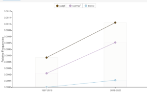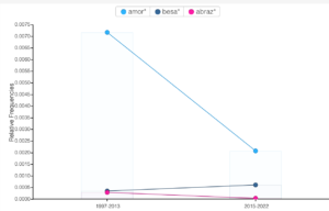 Además del contenido sexual, estaba interesada en la diferencia de la manera en que las reggaetoneras de diferentes generaciones cantaban sobre amor, porque creo que esto dice algo sobre las intenciones de cada artista. La primera grafico debajo se muestran la frecuencia relativa de las palabras que son asociado con amor romántico, fuera de sexo como; amor, beso, abrazo, alma, y corazón. Lo que encontré es que las reggaetoneras más viejas cantan más sobre amor en un sentido más romántico en comparación con las más nuevas. Esto fue soportado por la segunda grafica que se muestra palabras más asociada con amor en términos de sexo, como papi, sexo, y cama. Esta gráfica se muestra una tendencia opuesta de la primera gráfica. Reggaetoneras más nuevas cantan más sobre amor en una manera más sexual en comparación a las viejas, mostrando la progresión de la eliminación del tabú sobre mujeres cantando sobre sexo.